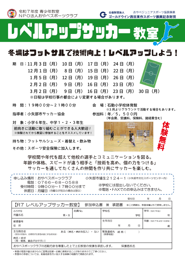 会 場:石動小学校体育館 ※3月よりグラウンドで活動する場合もあります。