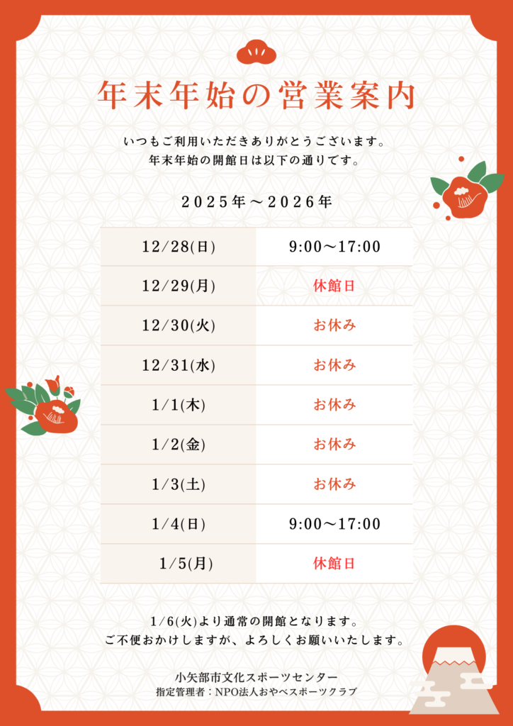 2025年12月22日 / 最終更新日時 : 2025年12月22日 NPO-oyabe-sc-680588 施設案内 年末年始の開館日について【小矢部市文化スポーツセンター】 年末年始の開館日は以下の通りとなります。 12/29(月)~1/3(土)までは休館日となります。 ご不便をおかけしますが、よろしくお願いいたします。
