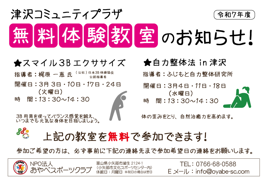 無料体験教室のお知らせ!(津沢コミュニティプラザ)